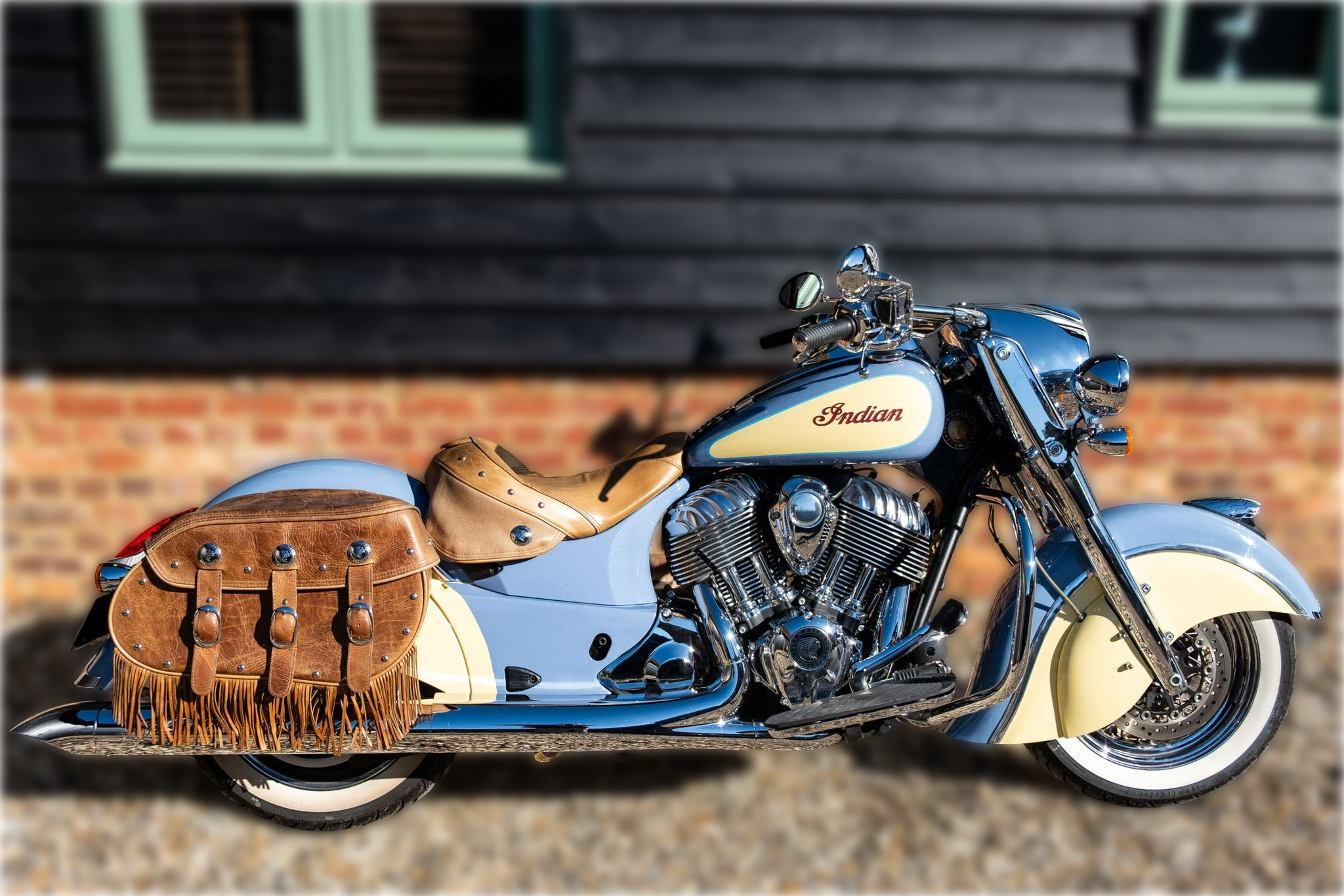 This is Craigs second Chief from the Foundry , this 2015 beauty was originally red , but craig did the paint job himself in British Standard Colours , removed the screen ,and pillion seat in homage to the original springfield era chiefs, a one off stunning example of individuality .